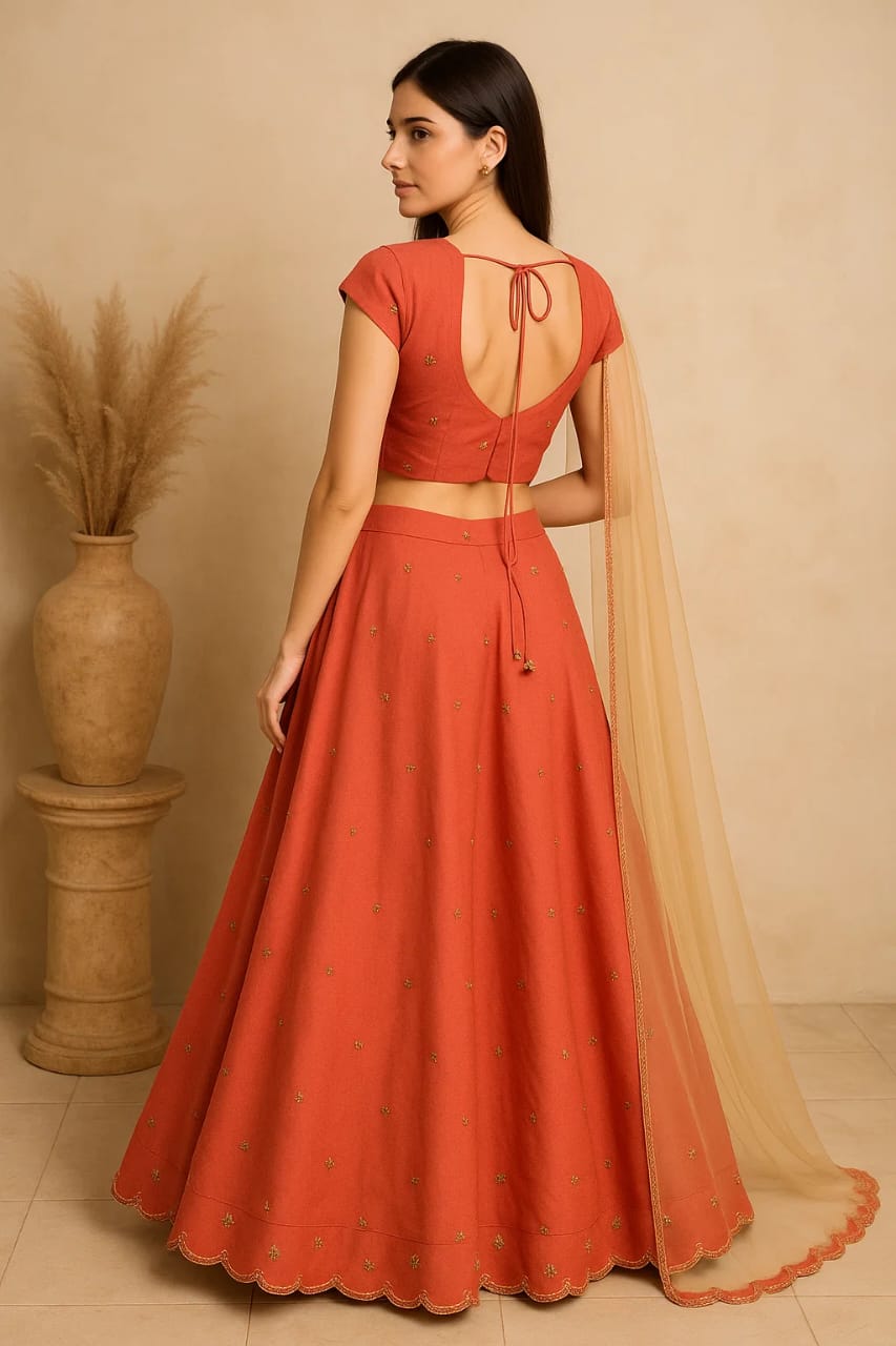 Elevate your wardrobe with this customised georgette purple lehenga from Radhika Rajpurohit Designer Studio. Designed with stunning mirror embellishments and delicate small plate detailing, this lehenga features an elegant umbrella cut and full flare, creating a striking silhouette that’s both traditional and contemporary.
