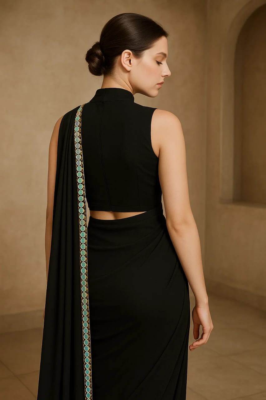 Designer Black Dhoti Drape Saree with Mirror Embellishments – By Radhika Rajpurohit
